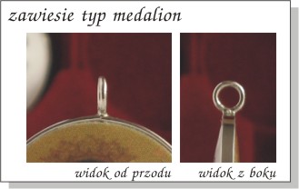 Dla podniesienia walorów estetycznych medaliony z naszej pracowni oprawiamy w niklowane galwanicznie miedziane obrączki z zawiesiem. Na zamówienie oferujemy również obrączki pozłacane, ze srebra (próba 0,925) oraz złota (14-karatowe). Medaliony oprawione w srebro oraz złoto oferujemy z dwoma rodzajami zawiesia (patrz rysunki obok): typ medalion - umożliwiający zawieszenie na szyi lub typ medal - umożliwiający zawieszenie bezposrednio na ścianie. Wszystkie wyroby z metali szlachetnych znakujemy logo pracowni.