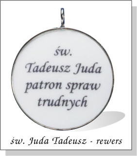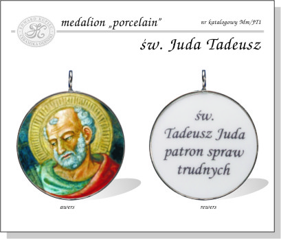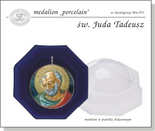 Opis medalionuMedalion ze szlachetnej, białej porcelany, dwustronnie wypukły o średnicy 32 mm. Awers medalionu przedstawia postać św. Judy Tadeusza, zaś na rewersie widnieje napis: „św. Tadeusz Juda patron spraw trudnych". Technologia „porcelain” zapewnia, że medalion jest odporny na ścieranie a kolory zachowują trwałość na pokolenia. Oprawiony jest w metalową obrączkę z zawieszką. Krótka notka o świętym