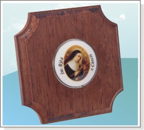 Wizerunek świętego w drewnie to wypukły krążek ze szlachetnej, białej porcelany przedstawiający postać św. Rity z Cascii (wer.2). Mahoniowe drewno o frezowanych bokach, nielakierowane podkreśla walory artystyczne "porcelain". Tak wykonany wizerunek świętej można ustawić na półce lub powiesić na ścianie.
